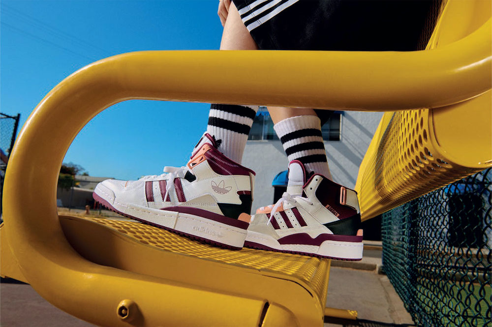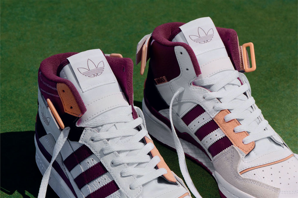 ホワイトをベースに、スリーストライプス、ライナー、アウトソールにバーガンディをあしらった「Forum Exhibit Mid」。ライトサーモンでキュートなアクセントもプラス。