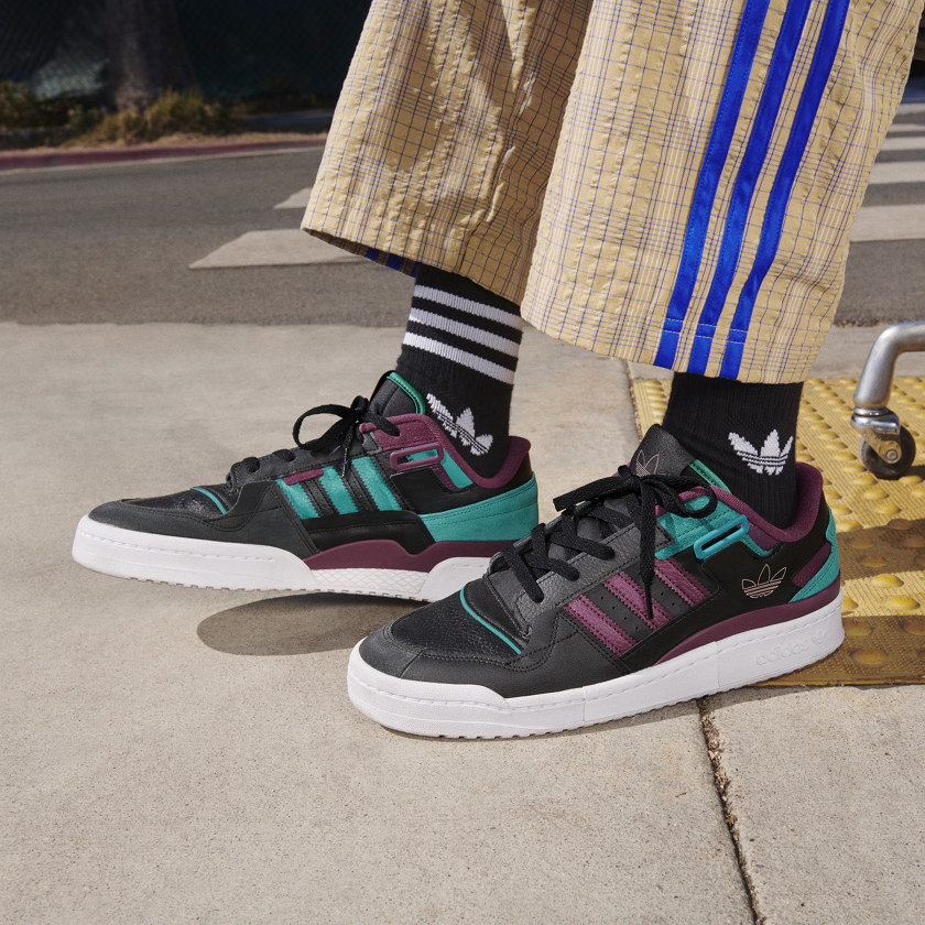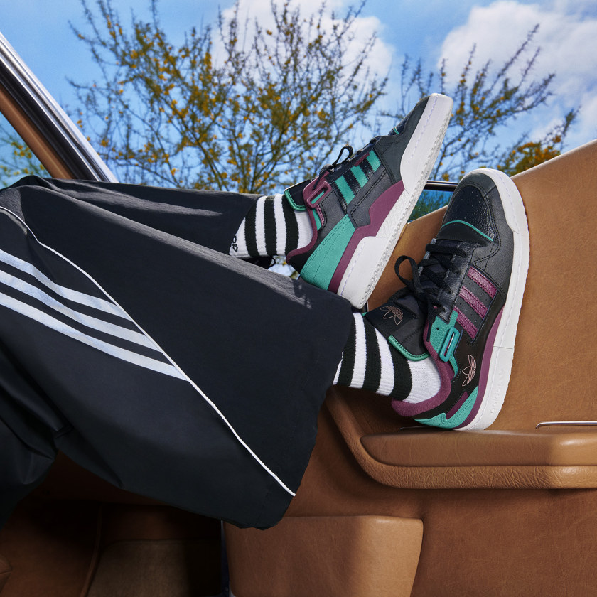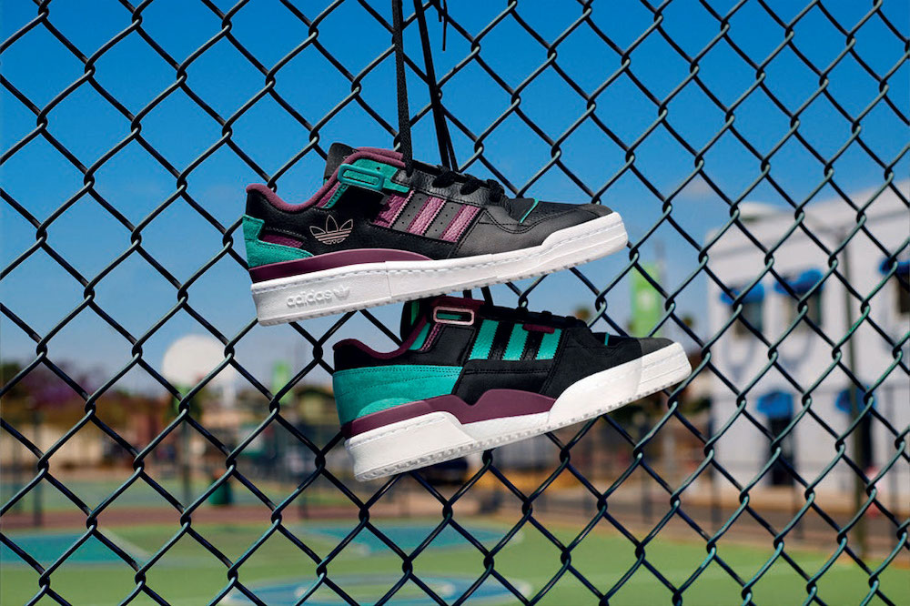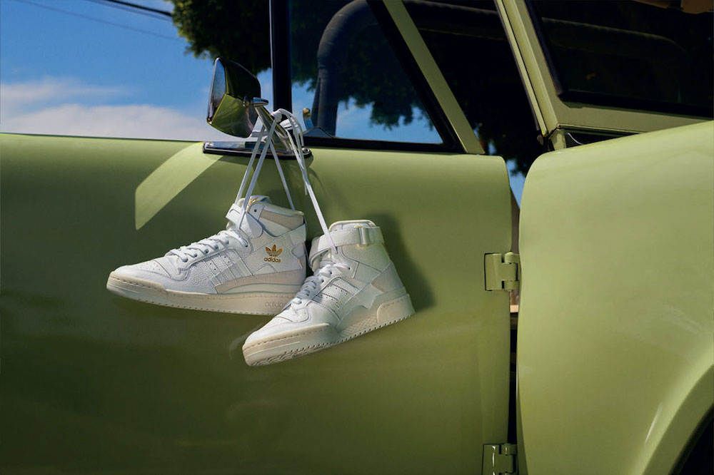 ローカットバージョンの「Forum Exhibit」は、ブラックをベースにパープルとティールの色調を加えたデザインに、ゴールドのトレフォイルロゴを、ハイカットバージョンの「Forum 84 High」は、クリームホワイトを全体に採用し高級感あふれるデザインに仕上げています。