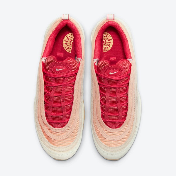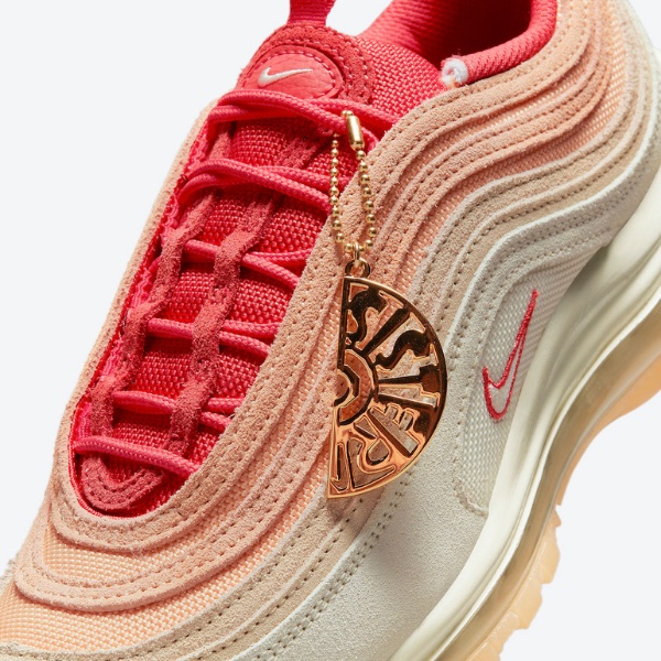 特にアッパーにデザインされたグラデーションが目を引きます。AM97の特徴であるレイヤー構造のアッパーを利用したカラーデザインは、鮮やかなレッド/オレンジの色調から始まり、靴底に向かって徐々にサーモンピンクからカシミア風な色調へと変化する見事な配色が印象的。また、クリーム色のスエードやメッシュを使用することで、清潔感と高級感を演出。