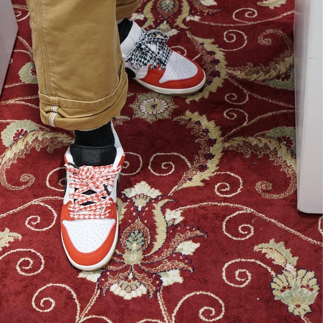 ずれたようなスウッシュだけでなく、シューレースにもユニークなアイデアを加えたコラボならではの一足です。