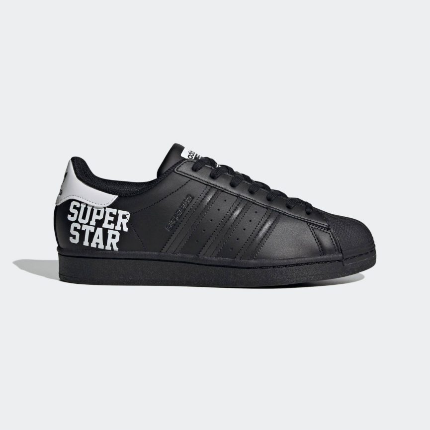 黒のボディに白のギザギザのスリーストライプスと、スーパースターボックスロゴが目を引く特徴的なデザイン。