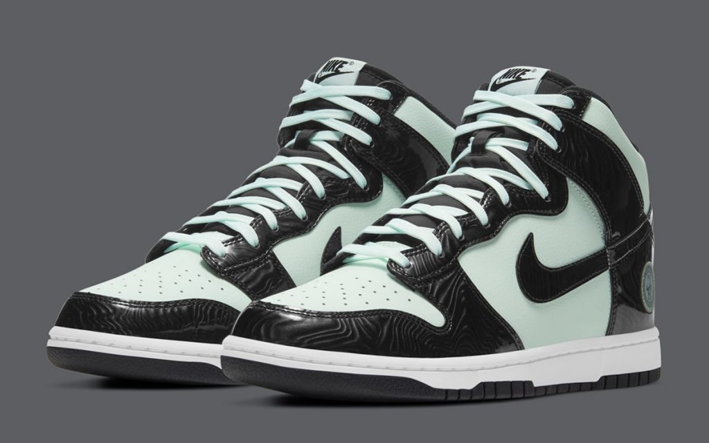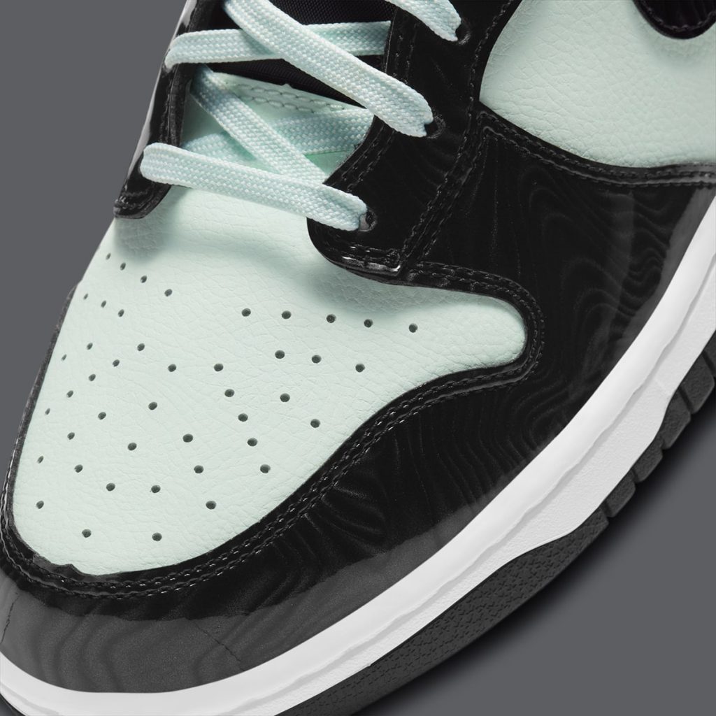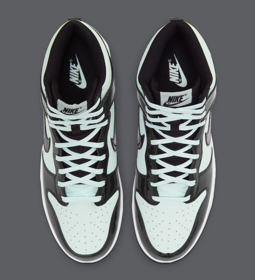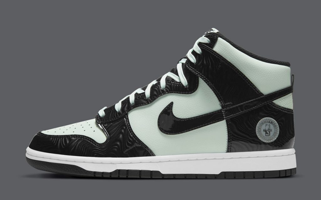 今回の新作はDunk High (ダンク ハイ)をベースに、ミントグリーンのレザーとブラックのパテントレザーを採用。