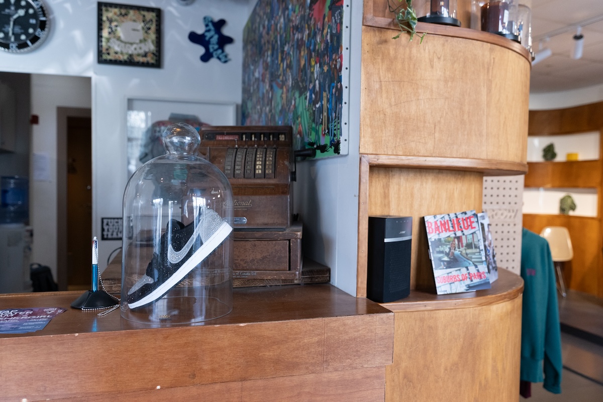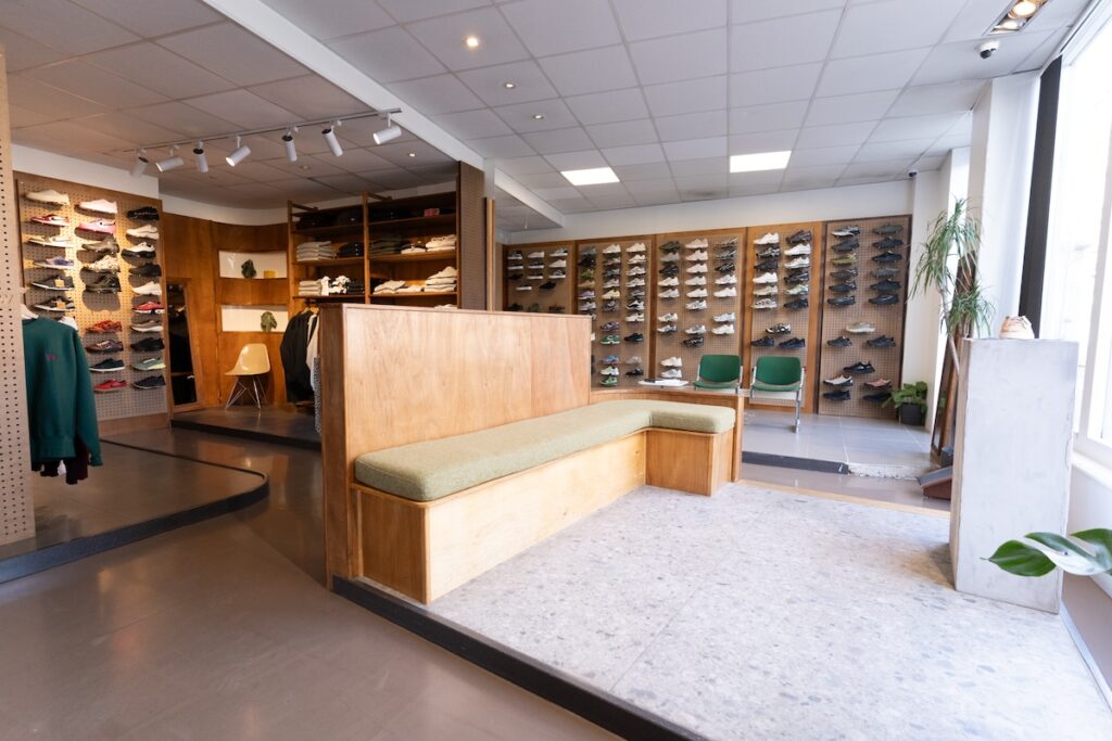 スニーカーやアパレルをただ並べるのではなく、空間全体のリズムや視線の流れまでセンスよく配置され、どこを切り取っても絵になります。商品の魅力を引き立てるだけでなく、ショップ自体のカルチャー性を静かに語っているのが印象的です。