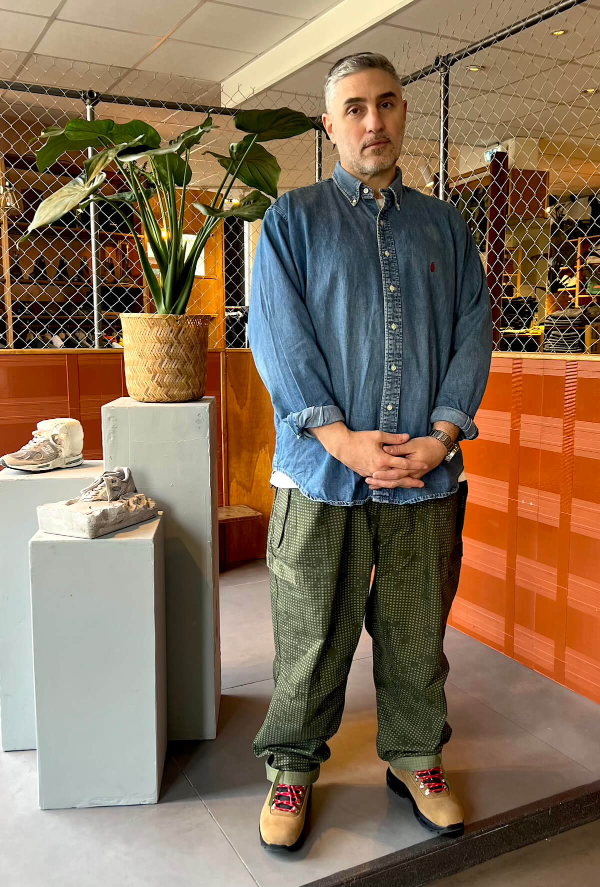 Tシャツ一枚、ワークパンツ一本、ヘッドウェアや小物に至るまで、どれを取っても“スニーカーありきの服”ではなく、全身のスタイリングをイメージしながら買い物ができるのが楽しいポイントです。