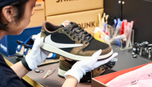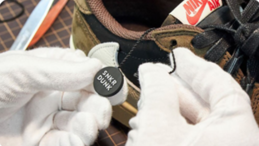 高度な鑑定知識を持った鑑定士が1つのスニーカーを複数人で鑑定を行っています。